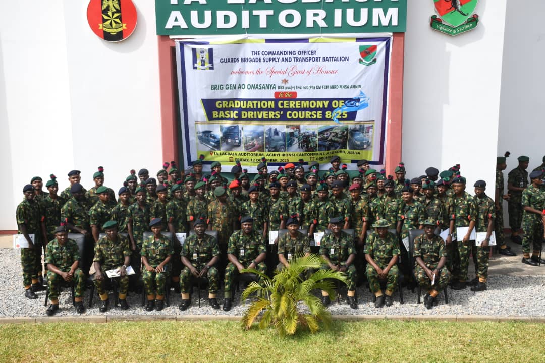 The Nigerian Army Guards Brigade has reaffirmed its commitment to continuous training and capacity building with the graduation of 66 students from the Basic Driver’s Course 8/2025 at the T.A. Lagbaja Auditorium, Aguiyi Ironsi Cantonment, Abuja.